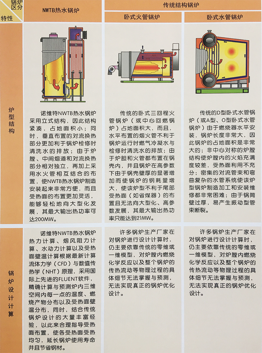 • 在七十年代以前,芬蘭大型燃氣或油熱水鍋爐的尾部對流受熱面也采用水管蛇形管束的結構,這種傳統的結構是在蒸汽鍋爐設計的基礎上改造而成的。結果運行中發現,這種結構的管子極易被腐蝕,無論采用何種措施都無法從根本上減輕或避免腐蝕現象的發生,因此開發一種專門為熱水鍋爐設計的新型的結構,根本解決低溫腐蝕現象迫在眉睫。通過大量研究,芬蘭諾維特的創始人開發了NWTB型熱水鍋爐,顛覆了傳統的由燃煤蒸汽鍋爐改造成的熱水鍋爐的結構,而其中垂直布置的尾部對流火管受熱面從根本上解決了低溫腐蝕的現象。
